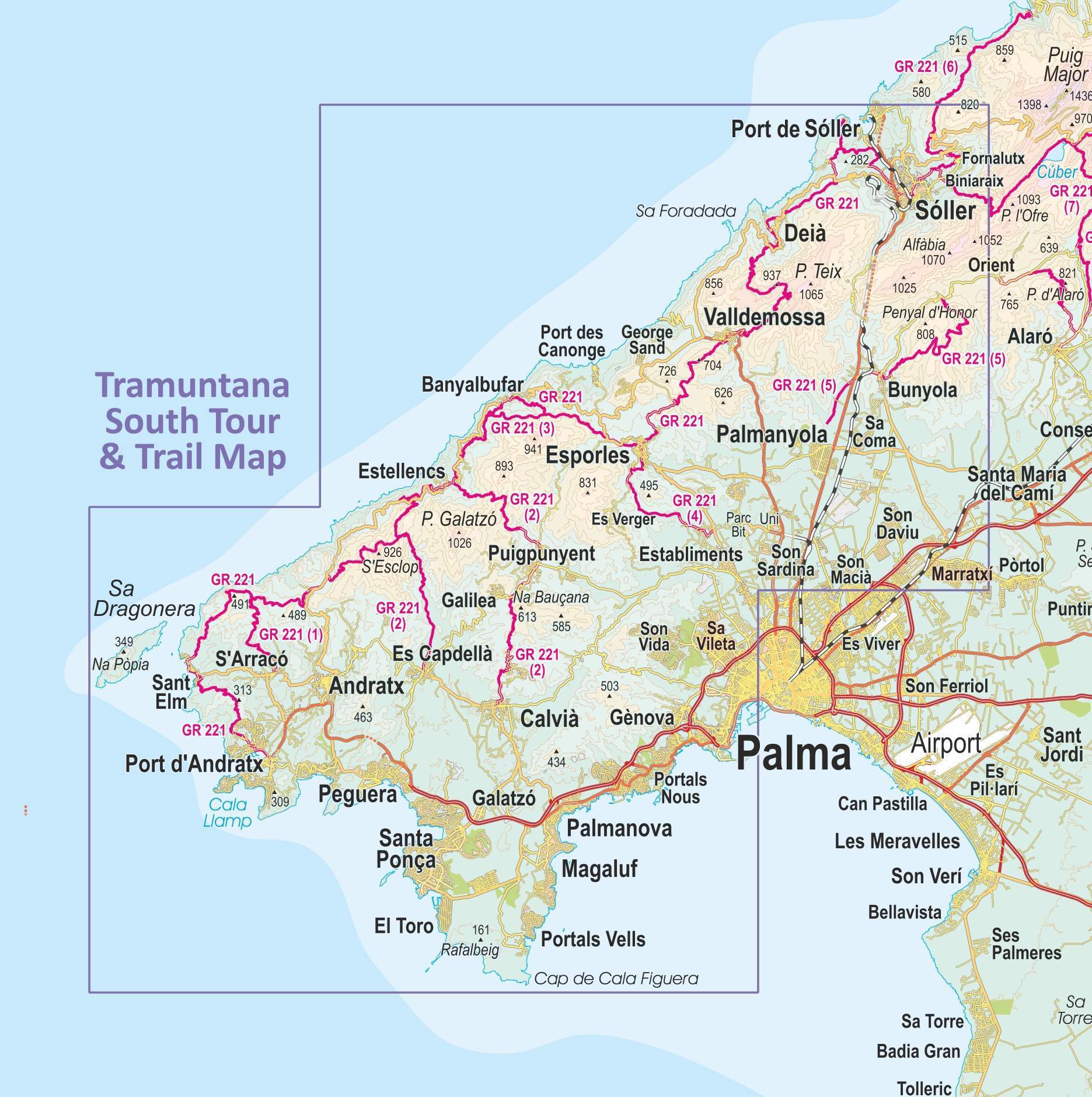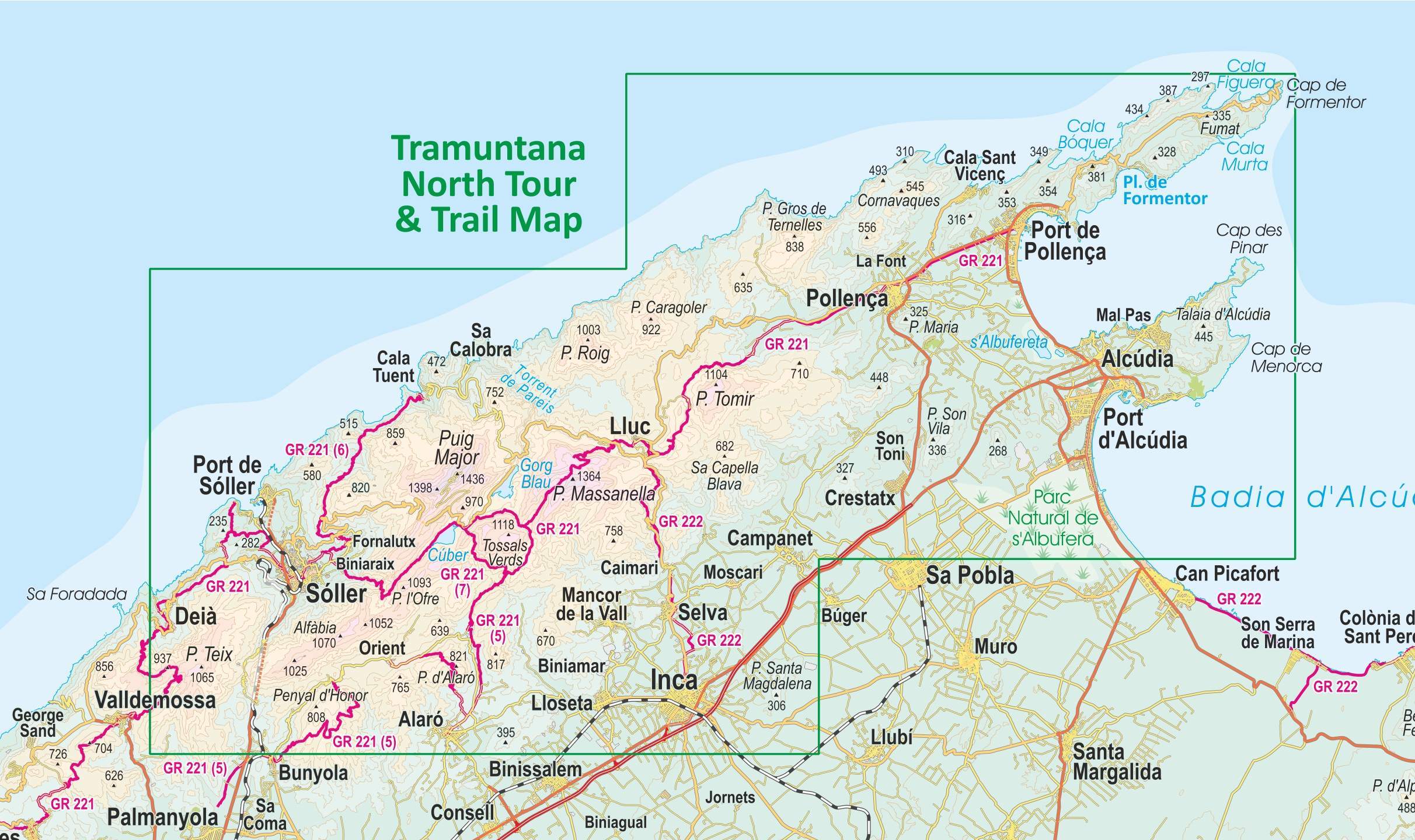 This map covers a continuous area from Tramuntana’s northern-most Cap de Formentor, including all the coastal resorts such as Port de Pollença and Port d’Alcúdia, all the way to Sóller and Deià at the opposite end of the map (for the area from Sóller further due south-west to Magaluf, Peguera and Port d’Andratx, see our second title: Mallorca – Tramuntana South Tour & Trail Map).