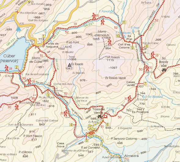 The sheet maps are useful, although the 1:40,000 scale in the Spanish countryside is at the limit for precise navigating, the roads on the map translate as 55 metres wide on the ground – easily enough to get misplaced for a while. Some of what appear as roads are overgrown dirt tracks that are now footpaths, you can still get through but it can be a bit confusing so if you want to go off the marked routes you will need to be patient.