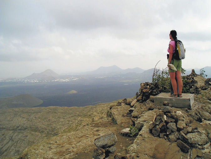 Standing on the volcanic crater rim of Caldera Blanca, Lanzarote.